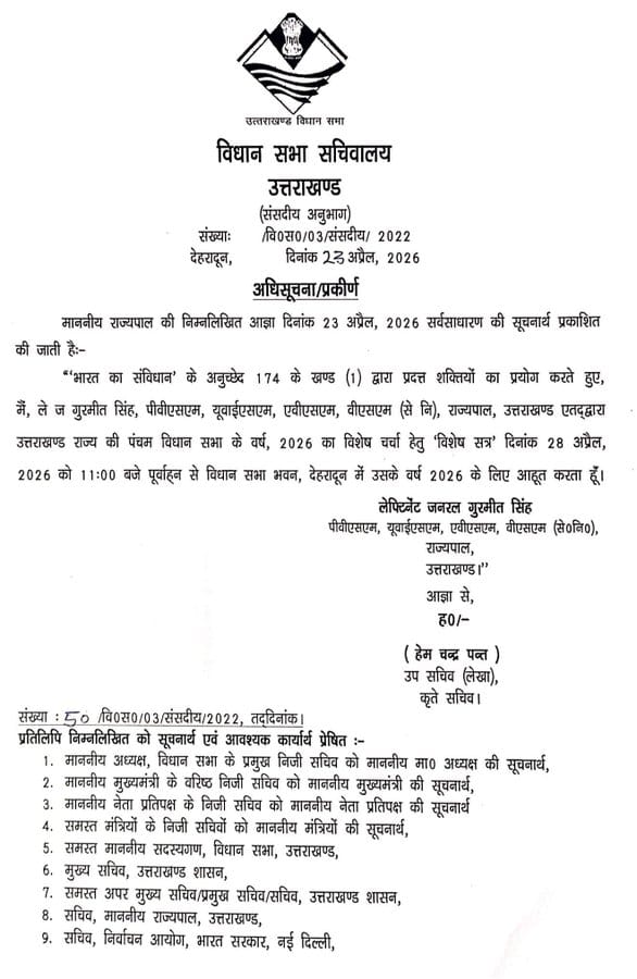 नारी शक्ति वंदन अधिनियम: 28 अप्रैल को होगा उत्तराखंड विधानसभा का विशेष सत्र, राज्यपाल ने जारी की अधिसूचना – उत्तराखंड विधानसभा महिला आरक्षण के लिए 28 अप्रैल को आयोजित होगा विशेष सत्र, राज्यपाल ने जारी की अधिसूचना